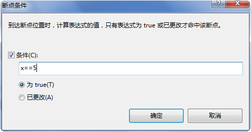 这时弹出一个对话框供你设置激活该断点所需的条件。比如:我们希望只有当x==5时,调试才中断。我们可以写出如下的表达式: