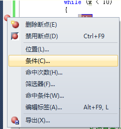 针对上述情况,Visual Studio提供了一个方便得多的功能——“条件中断”。只有当程序满足了开发人员预设的条件后,条件断点才会被触发,调试器中断。这将避免频繁地手工检查/恢复程序运行,大量减少调试过程中的手工和烦琐工作。