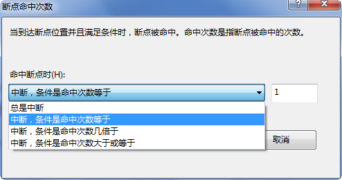 有时你希望,只有当第N次满足条件的运行到达断点时,才中断程序运行。例如:当第一次命中断点。可以通过右击断点,然后在弹出菜单上选择“命中次数”菜单命令实现。