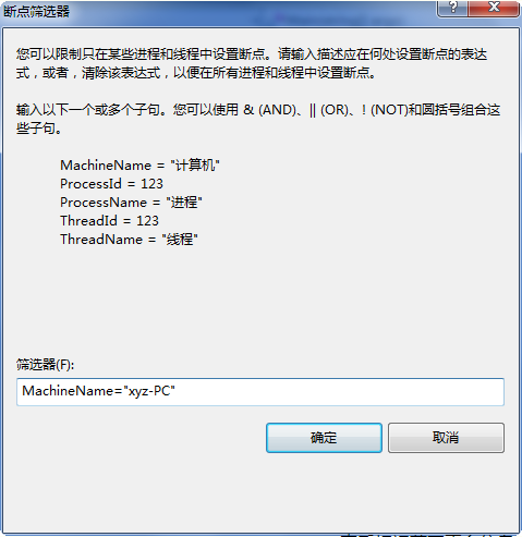例如,在调试一个服务程序时在其内部打上了断点,由于这是一个公用的服务不希望其他访问这个服务的程序被所设断点调试干扰,怎么办?断点筛选器就是限制只在某些进程和线程中设置断点。筛选器文本框中输入以下一个或多个子句,可以使用&(AND)、||(OR)、!(NOT)和圆括号组合这些子句描述应在何处设置断点的表达式,或者清除该表达式以便在所有进程和线程中设置断点。比如,希望断点只在被机器名为xye-PC的机器访问时才触发,我们可以右击断点进行断点筛选器设置。当其他机器访问程序的时候断点不会触发,其他机器访问时感觉不到断点的存在。