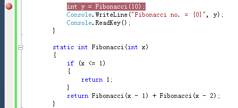 在调试过程中F5是执行到下一个断点。F11是逐语句,在执行到下图中的断点时,按F11会执行到Fibonacci方法里面逐步记录执行过程。F10是逐过程,与逐语句不同的是,在执行到下图中断点时,再执行会执行断点下面的语句,而不是去执行语句中的方法。