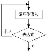 这个循环与 while 循环的不同在于:它先执行循环中的语句,然后再判断表达式是否为真, 如果为真则继续循环;如果为假, 则终止循环。因此, do-while 循环至少要执行一次循环语句。其执行过程可用下图表示。