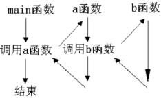 图表示了两层嵌套的情形。其执行过程是:执行 main 函数中调用 a 函数的语句时,即转去执行 a 函数,在 a 函数中调用 b 函数时,又转去执行 b 函数,b 函数执行完毕返回 a 函数的断点继续执行,a 函数执行完毕返回 main 函数的断点继续执行。