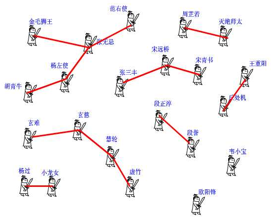 话说江湖上散落着各式各样的大侠,有上千个之多。他们没有什么正当职业,整天背着剑在外面走来走去,碰到和自己不是一路人的,就免不了要打一架。但大侠们有一个优点就是讲义气,绝对不打自己的朋友。而且他们信奉“朋友的朋友就是我的朋友”,只要是能通过朋友关系串联起来的,不管拐了多少个弯,都认为是自己人。这样一来,江湖上就形成了一个一个的帮派,通过两两之间的朋友关系串联起来。而不在同一个帮派的人,无论如何都无法通过朋友关系连起来,于是就可以放心往死了打。但是两个原本互不相识的人,如何判断是否属于一个朋友圈呢?