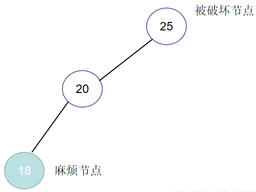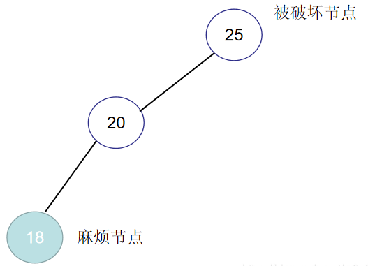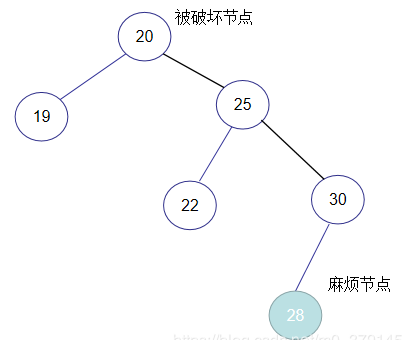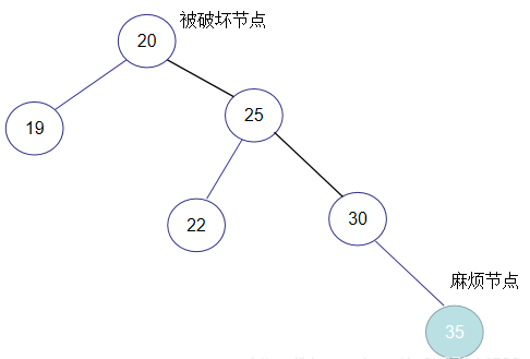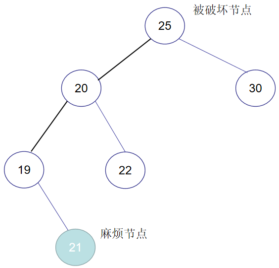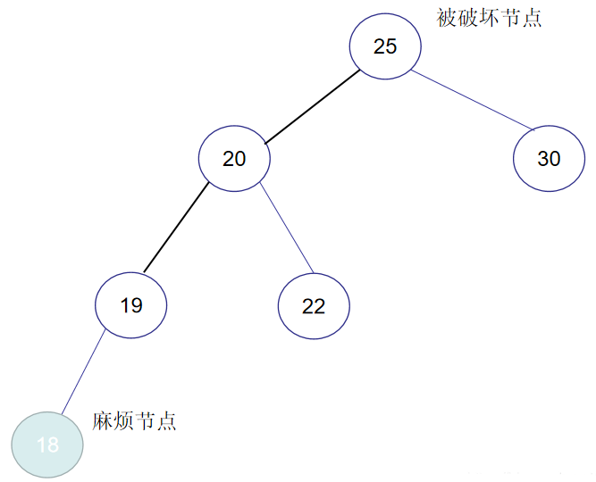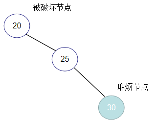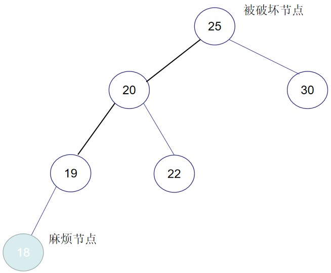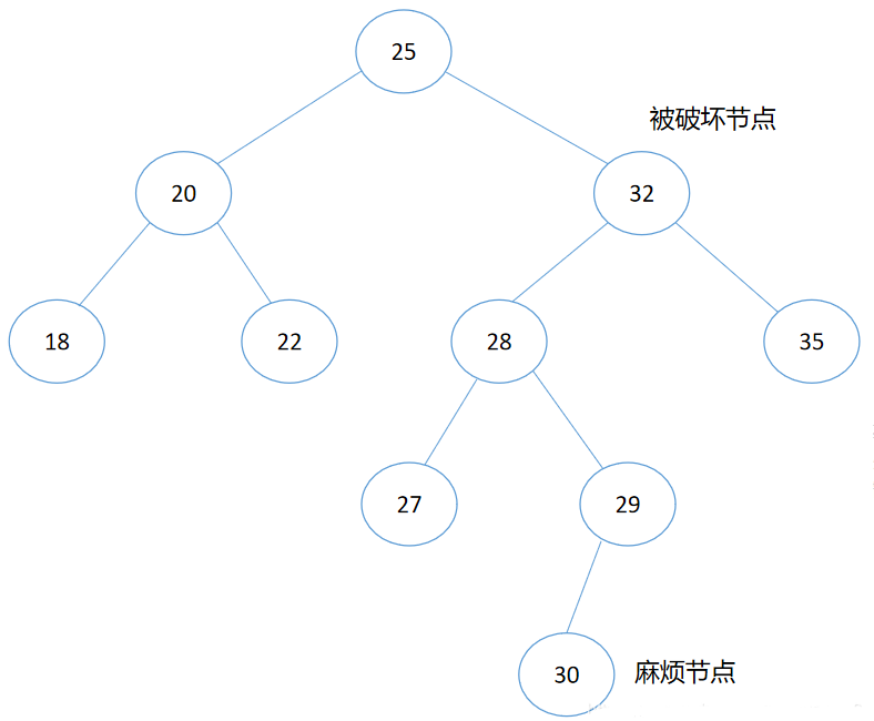 如上图,本是平衡的,如果我插入了一个新值是30的节点,那么这棵树的平衡性就会被破坏,它一共破坏了节点32和节点25的平衡性,虽然破坏了2个节点的平衡性,但我们只讨论最近被破坏节点的平衡性(因为底下的处理好了,上面的节点平衡性也会随之处理好),即新插入节点30破坏了节点32的平衡性,因为新插入节点而导致平衡性被破坏的节点也叫麻烦节点,而被其破坏平衡的节点叫被破坏节点。