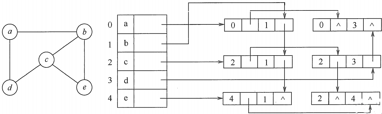 例如,上图所示为无向图的邻接多重表。在邻接多重表中,所有依附于同一顶点的边串联在同一链表中,由于每条边依附于两个顶点,则每个边结点同时链接在两个链表中。可见,对无向图而言,其邻接多重表和邻接表的差别,仅仅在于同一条边在邻接表中用两个结点表示,而在邻接多重表中只有一个结点。因此,除了在边结点中增加一个标志域外,邻接多重表所需的存储量和邻接表相同。在邻接多重表上,各种基本操作的实现亦和邻接表相似。