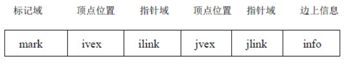 其中,顶点表由两个域组成,vertex 域存储和该顶点相关的信息firstedge 域指示第一条依附于该顶点的边;边表结点由六个域组成,mark 为标记域,可用以标记该条边是否被搜索过;ivex 和jvex 为该边依附的两个顶点在图中的位置;ilink 指向下一条依附于顶点ivex的边;jlink 指向下一条依附于顶点jvex 的边,info 为指向和边相关的各种信息的指针域。