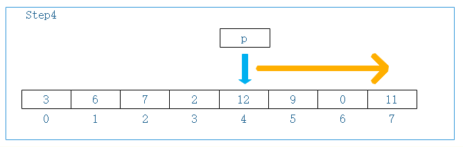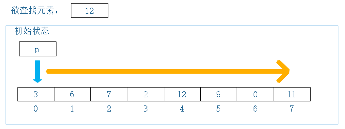 初始状态:指针p指向列表第一个元素,即索引为0元素,开始向右滑动,以匹配、查找目标