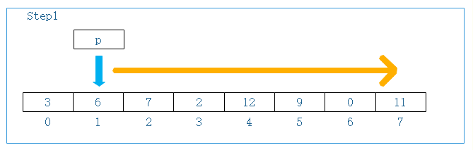 Step1:p指针开始向右滑行一个单位,进行比较