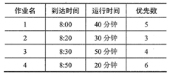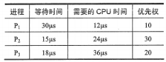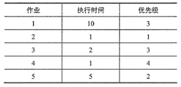 ,其在就绪队列中的等待时间,需要的CPU时间和优先权如下表所示。