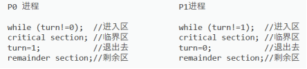 设置一个公用整型变量turn,用来表示允许进入临界区的进程标识。若turn为0, 则允许进程P0进入临界区;否则循环检查该变量,直到turn变为本进程标识;在退出区,修改允许进入进程的标识turn为1。进程P1的算法与此类似。