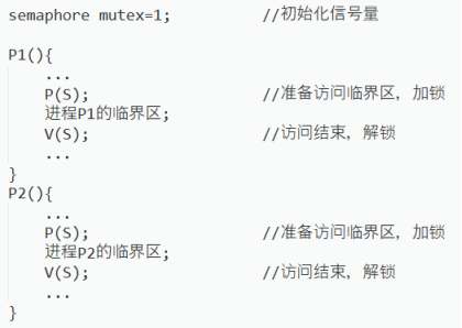 为使多个进程能互斥地访问某临界资源,只需为该资源设置一互斥信号量 mutex,并 设其初始值为 1,然后将各进程访问该资源的临界区CS置于 wait(mutex)和 signal(mutex)操作之间即可。