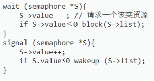 wait操作, S.value-表示进程请求一个该类资源,当 S.valuevO时,表示该类资源已分配完 毕,因此进程应调用block原语,进行自我阻塞,放弃处理机,并插入该类资源的等待队列S.L, 可见该机制遵循了 “让权等待”的准则。
