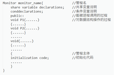 ③信息掩蔽,指管程中的数据结构只能被管程中的过程访问,这些过程也是在管程内部定义,供管程外的进程调用,而管程中的数据结构以及过程(函数)的具体实现外部不可见。