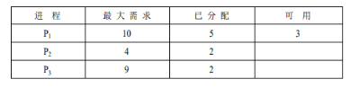 假定系统中有三个进程 P1、P2和P3,共有12台磁带机。进程P1总共要求10台磁带机,P2和P3分别要求 4 台和 9 台。 假设在T0时刻,进程 P1、P2和P3已分别获得5台、2台和2台磁带机,尚有3台空闲未分配,如下表所示: