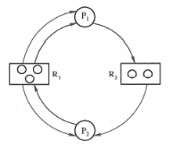 进程P1已占用两个R1资源,而且正在申请获得一个R2资源。进程P2已占用一个R1资源和一个R2资源,而且正在申请获得一个R1资源。