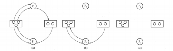 (2) 在进行一系列的简化后,若能消去图中所有的边,使所有的进程结点都成为孤立结点,则称该图是可完全简化的;若不能通过任何过程使该图完全简化,则称该图是不可完全简化的。