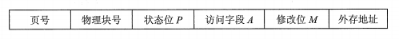 在请求分页系统中使用的主要数据结构仍然是页表,其基本作用是将程序地址空间中的逻辑地址转换成内存空间中的物理地址。页表项的字段:页号、物理块号、状态位P、访问字段A、修改位M、外存地址。