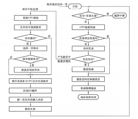 在请求分页存储管理系统中,若所访问的页面在内存中,其地址变换过程与分页存储管理相同;若访问的页面不在内存,便产生一个缺页中断,将该页面调入内存,再按照与基本分页存储管理相同的方式进行地址变换。