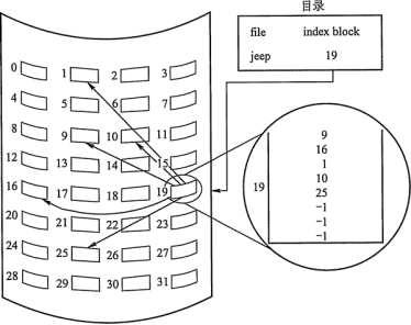 索引分配方式不仅支持直接访问,而且不会产生外部碎片,文件长度受限制的问题也得到了解决。每个文件都有其索引块,这是一个磁盘块地址的数组。索引块的第i个条目指向文件的第i个块。目录条目包括索引块的地址。要读第i块,通过索引块的第i个条目的指针来查找和读入所需的块。