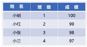 这是一张成绩单,如果把这张成绩单叫做一个数据对象的话,那么每一个人的姓名可以称作为一个数据项,而每一个人所有的信息是一个数据元素。这张表还有类似于小明排在小红前面这样的关系,这样的关系就是所说的结构。