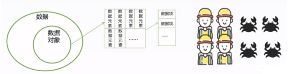 例如,上图是具有人物和螃蟹的数据的集合。其中所有的人物就是一个数据对象,它是具有相同性质的数据元素的集合;每一个人物都是一个数据元素,可能在该人物当中,帽子的颜色、书包的颜色都可以作为数据项。