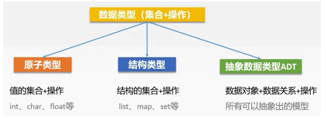 是一组值的集合和定义在该集合上的操作的总和。其中有原子类型,原子就是不可再分割的意思,它是原子类型值的集合和定义在该集合上的操作。例如在 C 语言中的 int、char、float 等都是原子类型。除了原子类型,还有结构类型,它是结构的集合和定义在集合上的操作。结构就是多个原子类型值的组合,其中有 list、map、set 等。最后还有抽象数据类型,它是数据模型以及定义在该数据模型上的操作,可以用一个三元组来表示,分别是数据对象、数据关系和相关的操作。