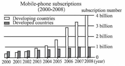 理由:文章基本涵盖了题目要求的核心内容要点,包括描述图表数据(发展中国家移动用户数激增、发达国家变化平缓)、分析原因(发展中国家经济科技发展、发达国家市场饱和)、总结趋势。但未明确提及"2000-2008年"的时间范围,且发达国家部分分析稍显简略,漏掉了一个次重点,因此扣0.5分。