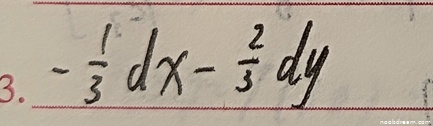 学生两次识别结果均为:$-\frac{1}{3}dx - \frac{2}{3}dy$。标准答案为$-\frac{1}{3}(d x+2 d y)$。将学生的答案展开后为$-\frac{1}{3}dx - \frac{2}{3}dy$,与标准答案$-\frac{1}{3}dx - \frac{2}{3}dy$完全一致。虽然书写形式略有不同(一个提取了公因式,一个未提取),但数学表达式等价,核心逻辑正确,计算结果准确。根据评分要求,思路正确不扣分,且不存在逻辑错误,因此得满分4分。
