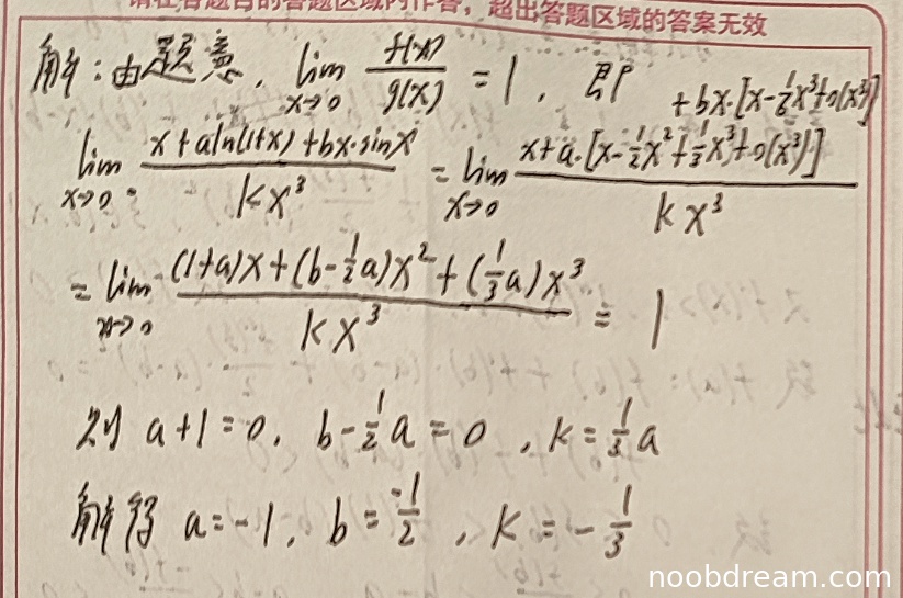 学生通过展开ln(1+x)和sinx的泰勒展开式,得到系数关系1+a=0,正确解得a=-1。思路与标准答案方法一一致,计算正确。得3分。