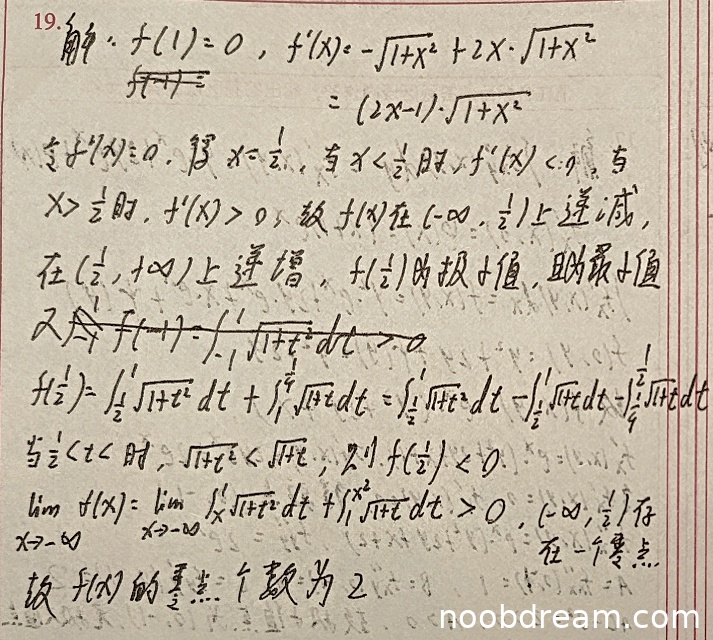 学生正确计算了f(-1)>0,并得出在(-∞,1/2)存在一个零点。但在极限计算中,第二次识别将∫₁ˣ²√(1+t)dt误写为∫₁ˣ²√(1+t²)dt,这是逻辑错误。第一次识别中极限分析基本正确但不够严谨。考虑到学生正确判断了两个区间各有一个零点,且x→+∞时f(x)→+∞的判断正确,扣2分,得3分。