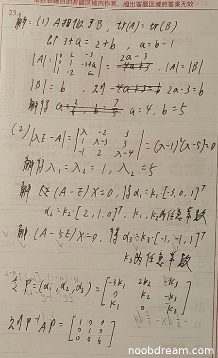 学生正确求出特征多项式(λ-1)²(λ-5)=0,得到特征值1,1,5正确。对于特征向量:两个识别结果都给出了正确的特征向量方向[-3,0,1]ᵀ、[2,1,0]ᵀ、[-1,-1,1]ᵀ。但最终构造的矩阵P中包含了任意常数k₁,k₂,k₃,这是不规范的,可逆矩阵P应该是具体的数值矩阵。此外第一次识别中写成了"2P⁻¹AP"多了一个系数2。考虑到特征值和特征向量的核心思路正确,但最终结果不规范,扣2分,本小题得4分。