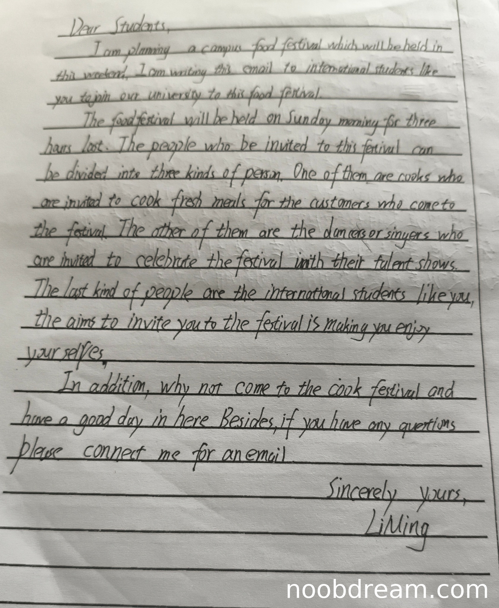 理由:邮件基本完成了题目要求的两个要点:介绍美食节和邀请国际学生参与。但内容组织存在较大问题,将受邀人群分为三类(厨师、表演者、国际学生)的表述偏离了邀请函的核心目的,使重点不够突出。国际学生作为受邀对象却被列为参与者类型之一,逻辑上不够合理。