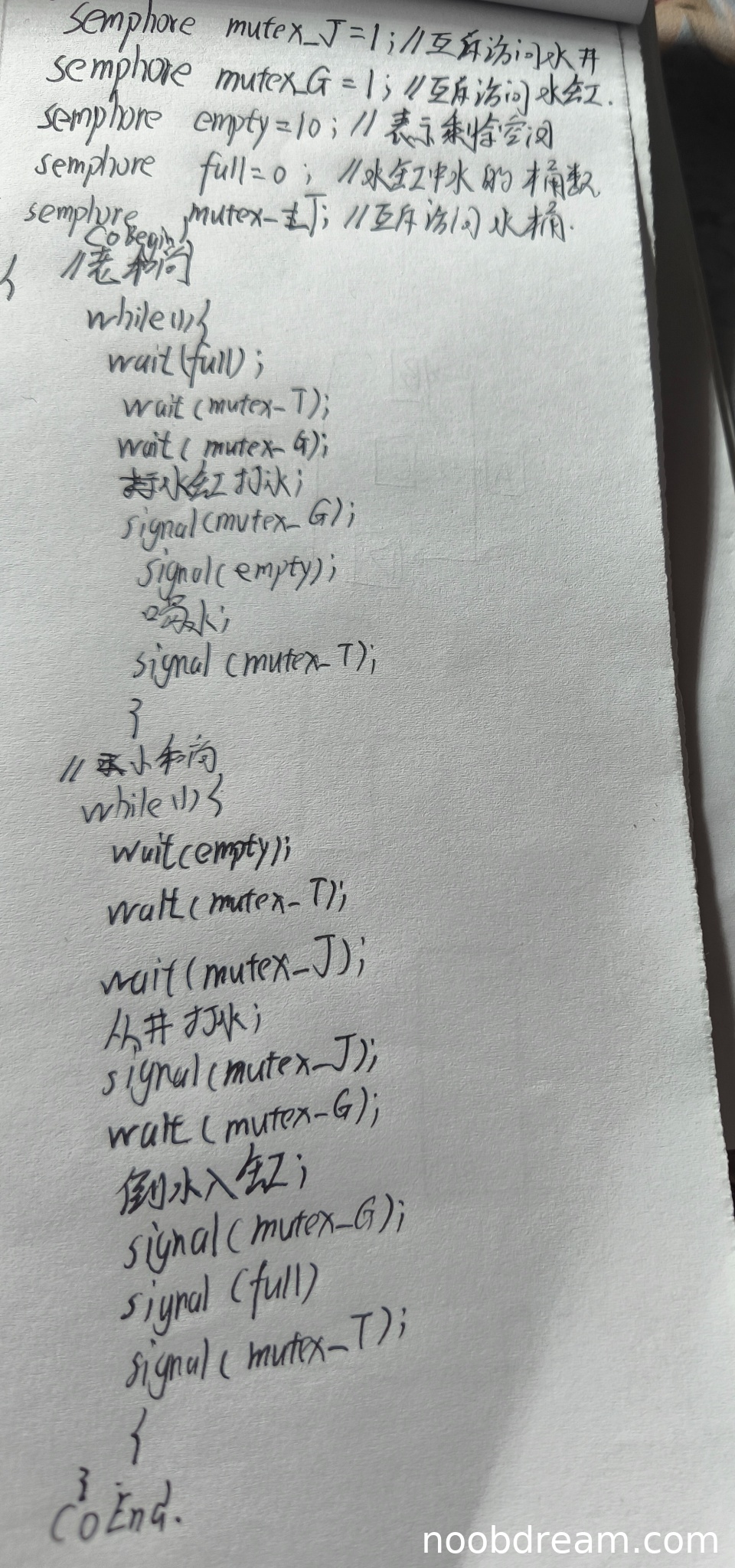 理由:基本流程正确,使用了正确的同步信号量(empty、full)和互斥信号量。但存在逻辑错误:在"倒水入缸"前多了一个"wait(mutex_G)",这会导致死锁,因为此时已经持有mutex_T。扣1分。