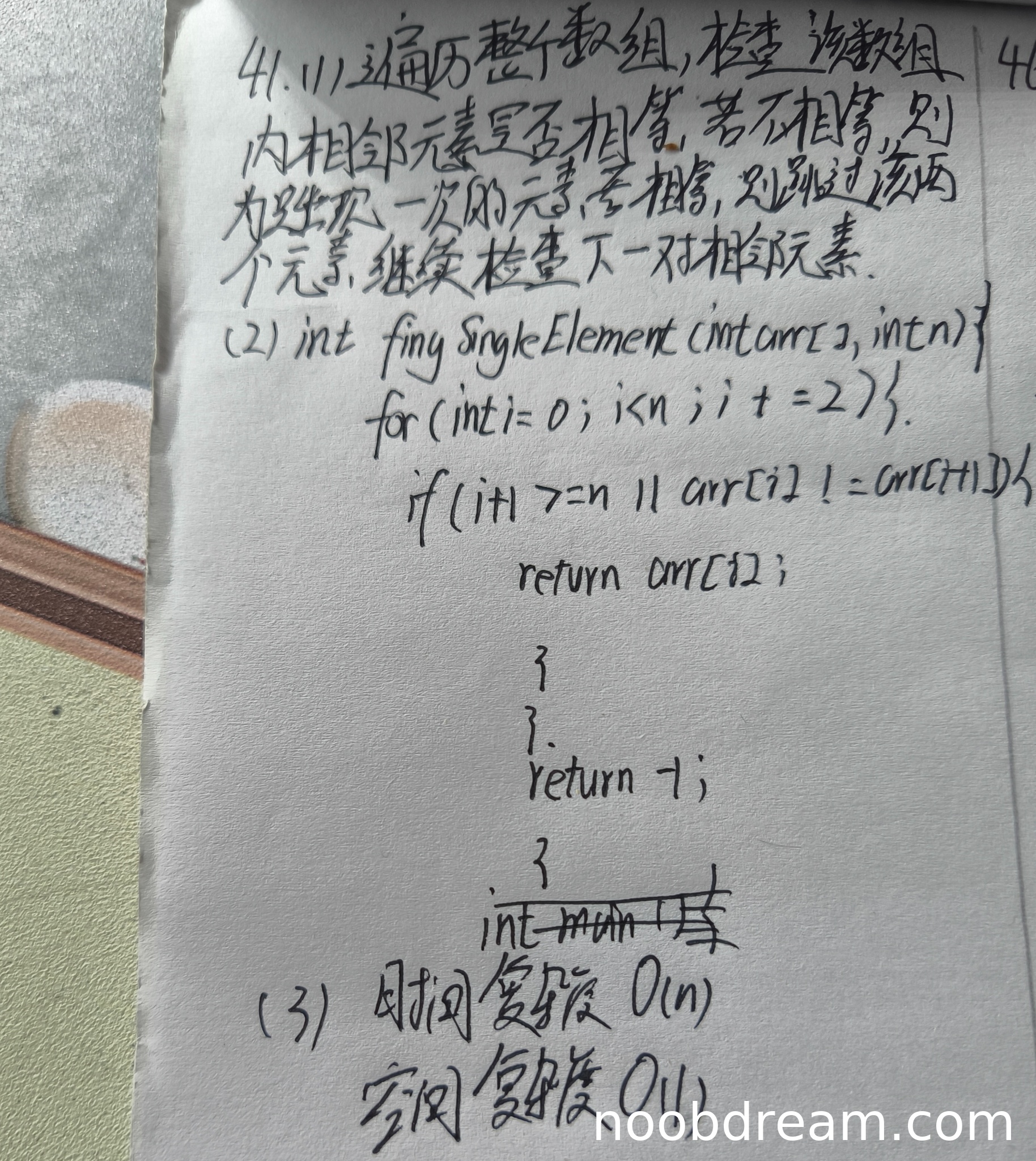 学生作答的基本设计思想是:遍历整个数组,每次检查相邻两个元素是否相等,如果不相等则前一个元素就是目标元素,如果相等则跳过这两个元素继续检查下一对。这个思路与标准答案基本一致,都是利用相邻元素比较来定位唯一出现一次的元素。虽然表述上略有不同,但核心思想正确。因此得3分。