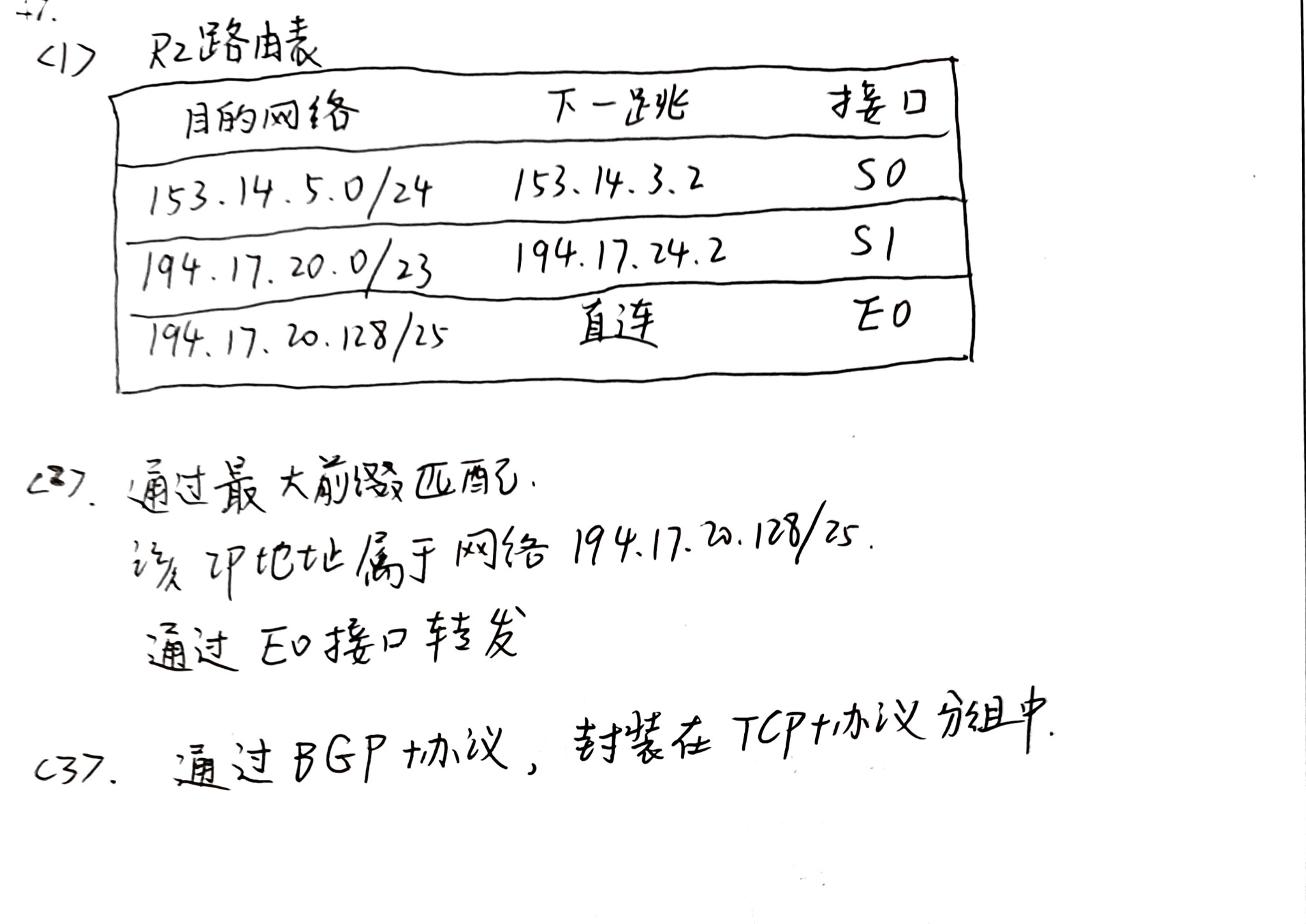 学生正确回答使用BGP协议交换路由信息,并正确指出封装在TCP协议中。答案完全正确,得2分。