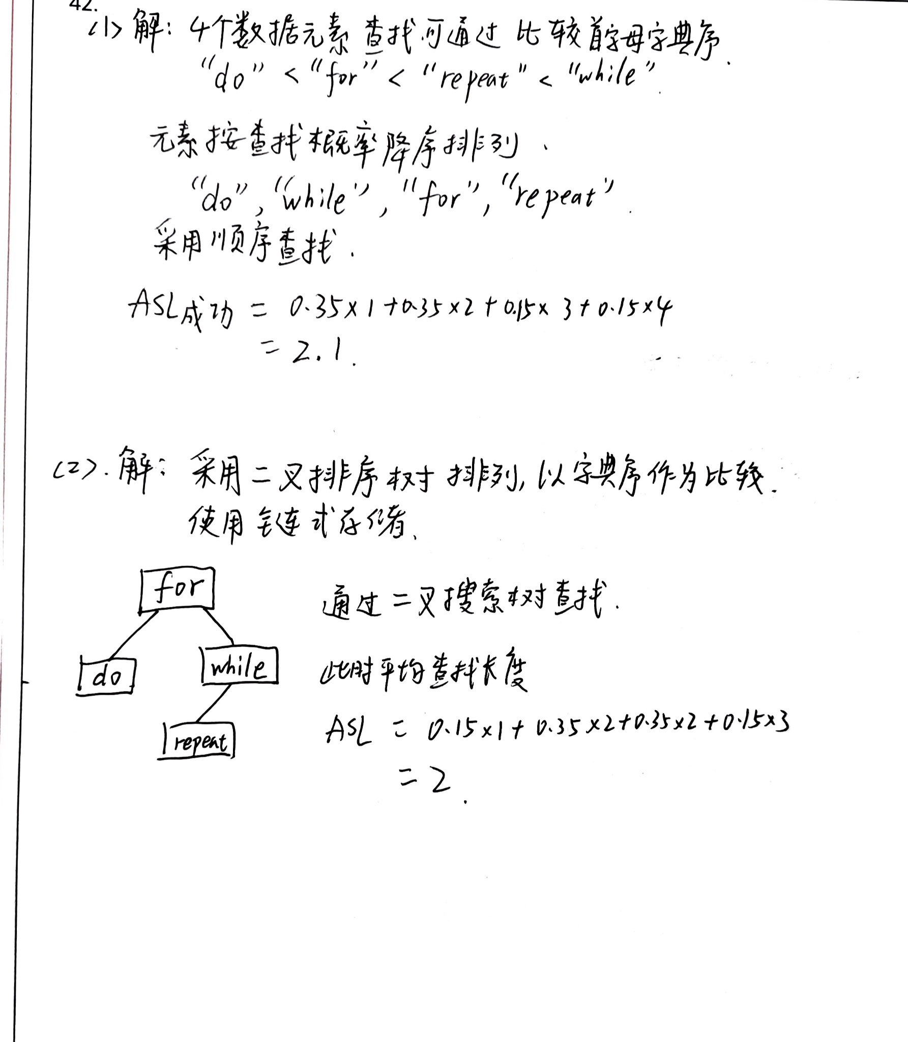 学生答案提出采用二叉排序树(二叉搜索树)排列,以字典序作为比较,使用链式存储,通过二叉搜索树查找,并正确计算了平均查找长度为2.0。这符合标准答案中的【答案二】方案。虽然学生未明确说明二叉排序树的具体构造方式(例如是否按查找概率优化),但根据其给出的ASL计算结果(2.0)与标准答案一致,且方案本身是合理且高效的。因此,本小题得5分。