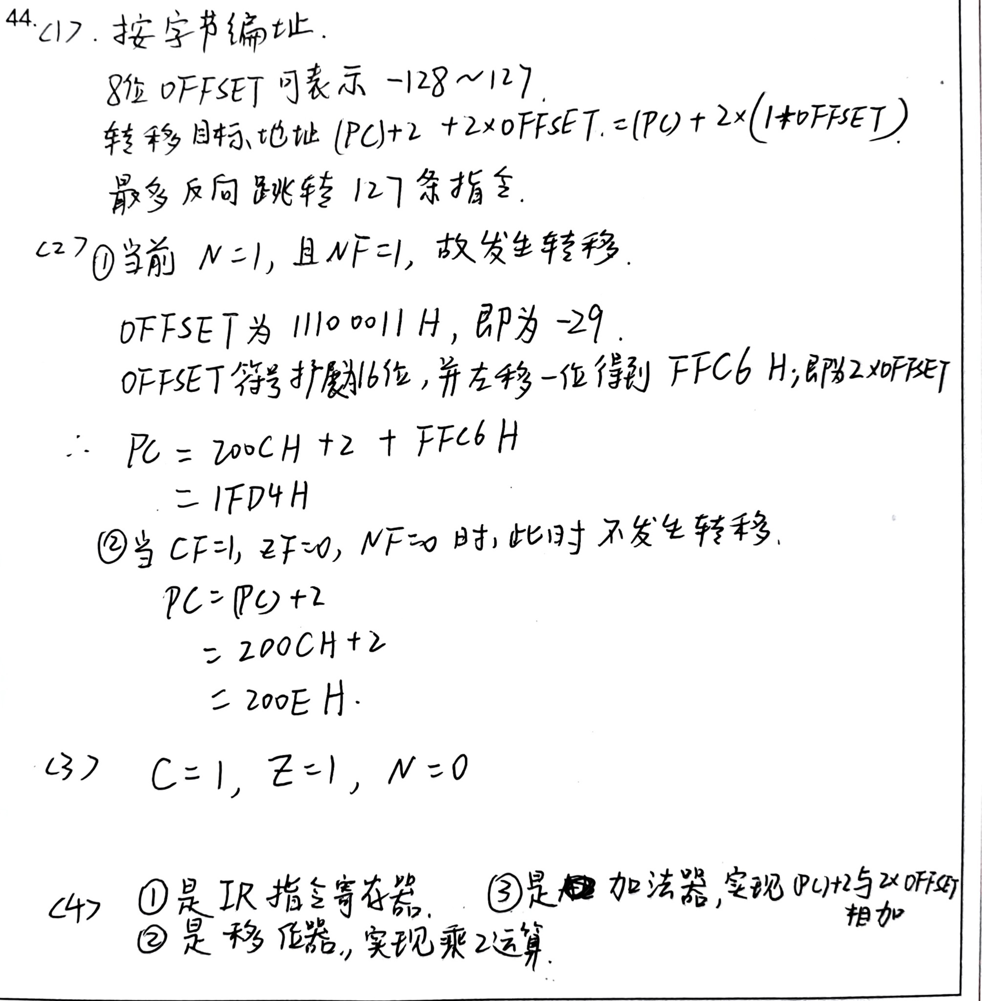 学生正确回答了存储器按字节编址(1分),并正确指出偏移量范围为-128~127(1分),且得出向后最多可跳转127条指令(1分)。答案与标准答案一致,得3分。