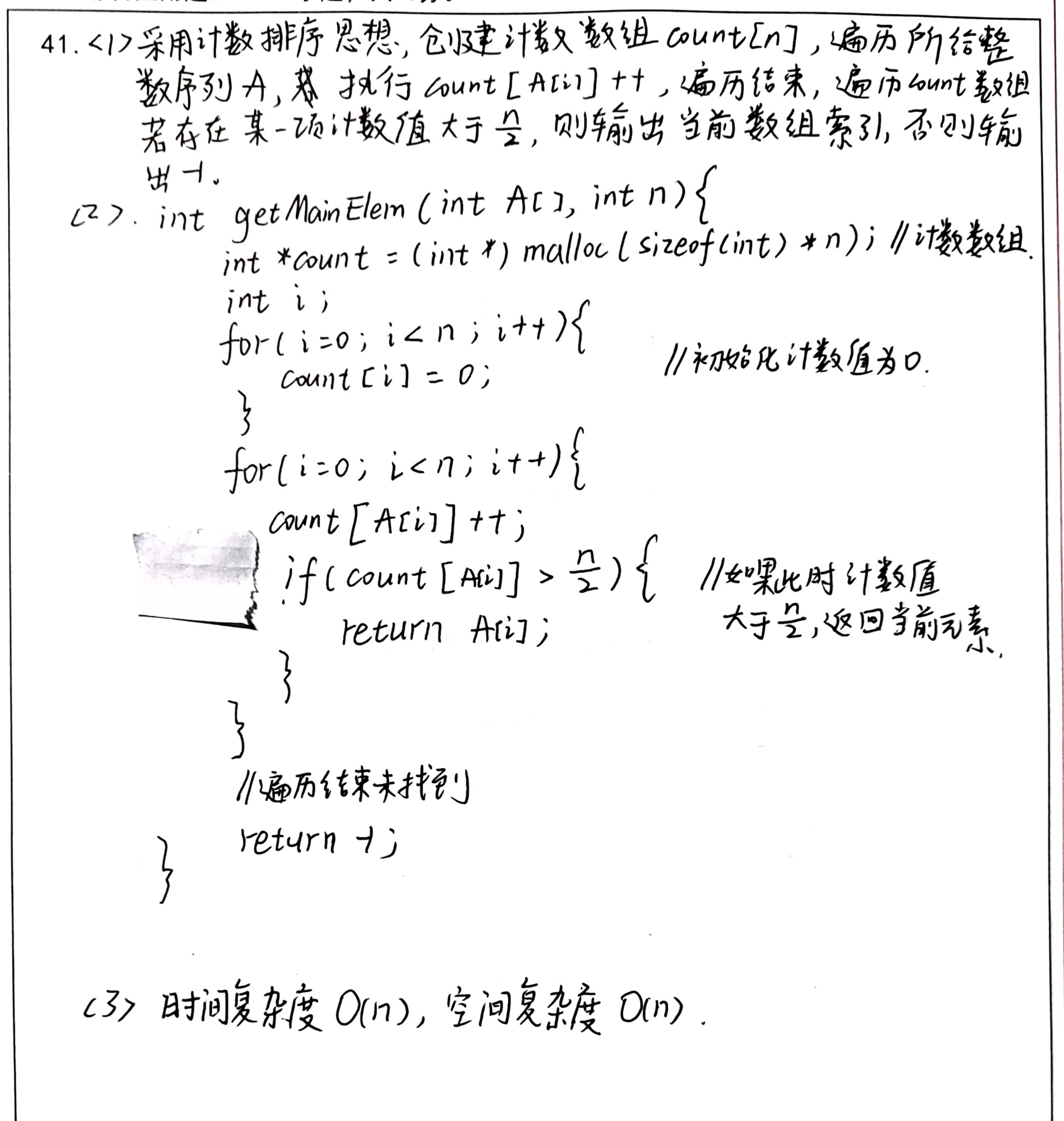 理由:学生的基本设计思想采用了计数排序的思路,通过创建计数数组统计每个元素的出现次数,然后检查是否有元素的计数超过n/2。这种方法能够正确找出主元素,思路是正确的。但与标准答案相比,这种方法需要额外的O(n)空间,而标准答案的空间复杂度为O(1)。由于题目要求"尽可能高效的算法",虽然思路正确,但在空间效率上不如标准答案,因此扣1分。