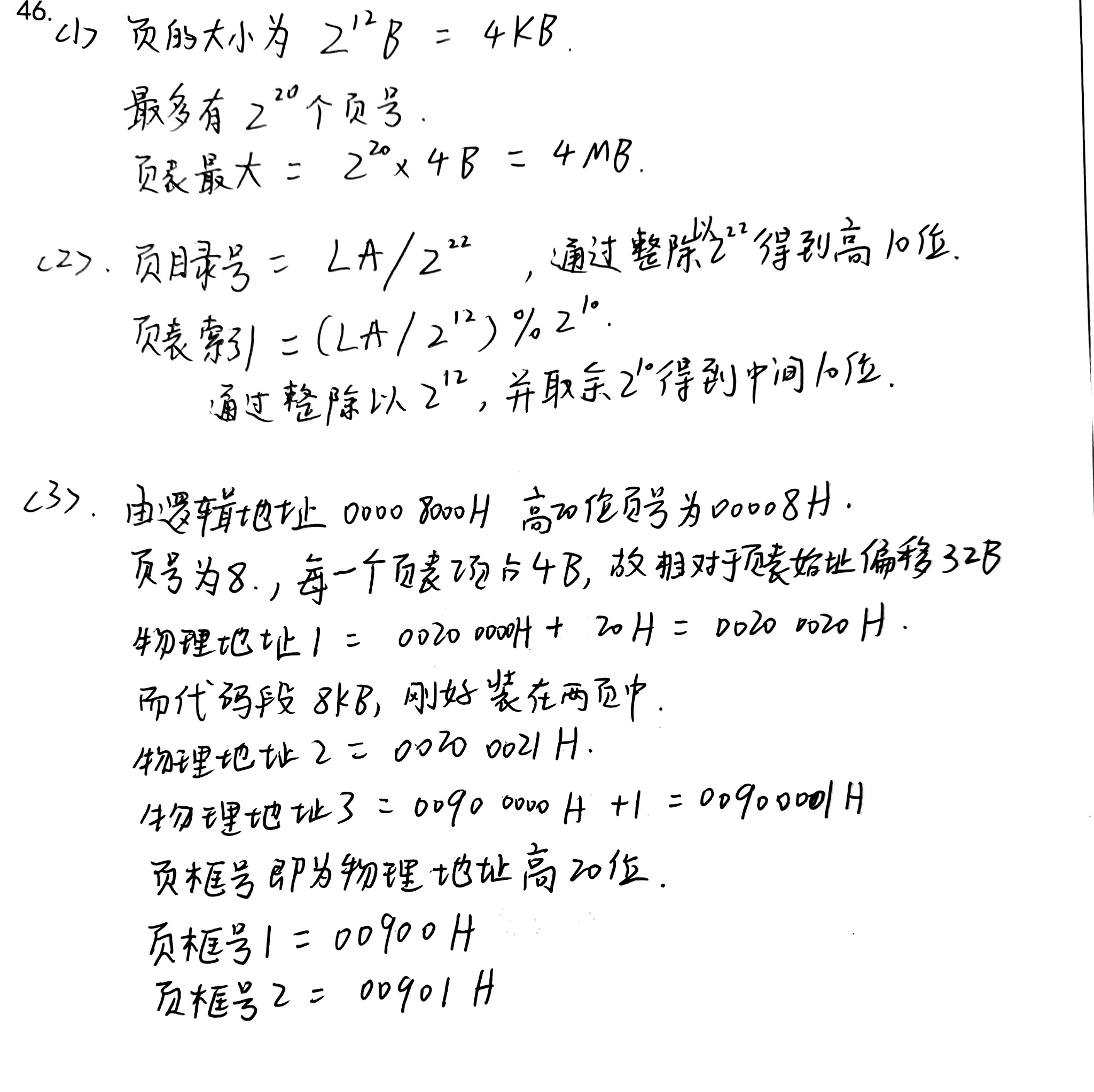 学生正确计算出第一个页表项的物理地址00200020H(0.5分),但第二个页表项物理地址00200021H错误(应为00200024H),扣0.5分。页框号1=00900H正确(0.5分),页框号2=00901H错误(应为00901H或00910H?这里需要确认:由于页大小为4KB,第二个页面起始物理地址应为00901000H,所以页框号应为00901H,学生答案正确),得0.5分。物理地址3=00900001H错误(应为00901000H),扣1分。本小题共得1.5分。