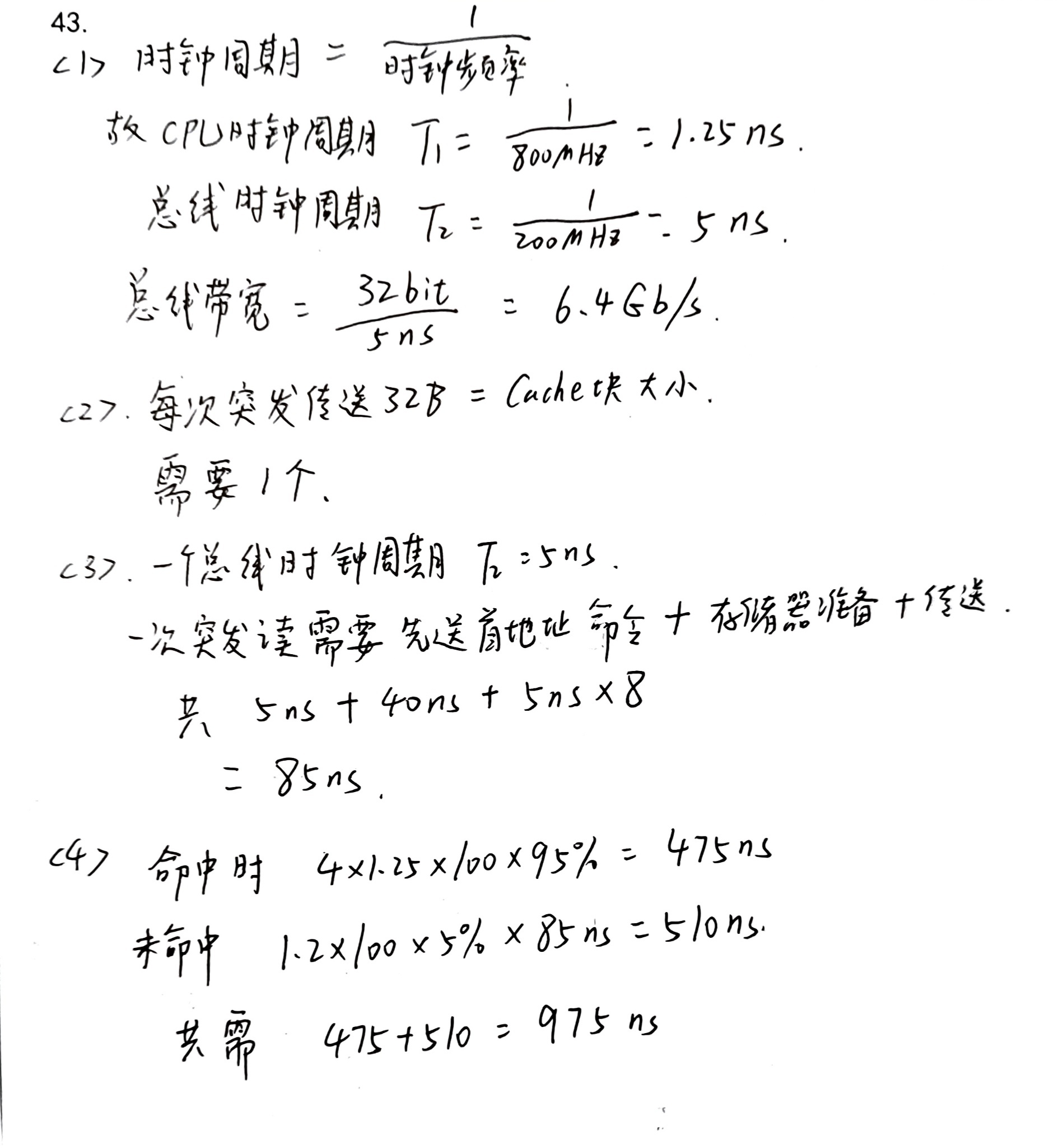 CPU时钟周期计算正确(1.25ns),得1分;总线时钟周期计算正确(5ns),得1分;总线带宽计算错误(标准答案为800MB/s,学生计算为6.4Gb/s),单位错误且数值错误,扣1分。本小题得2分。