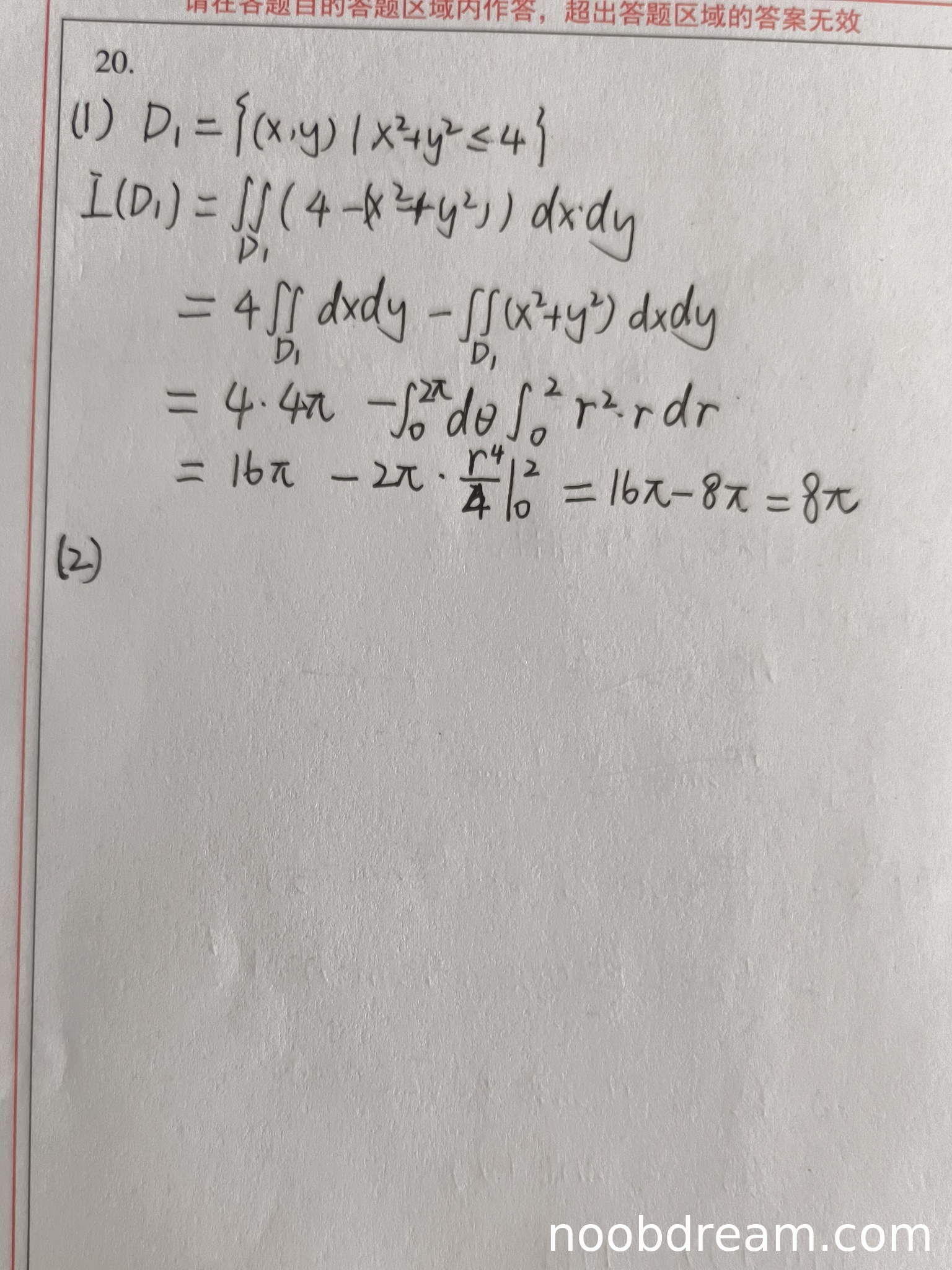 学生正确识别了使积分取最大值的区域 \(D_1\) 为圆盘 \(x^2 + y^2 \leq 4\),并正确计算了二重积分 \(I(D_1)\)。计算过程分为两部分:先计算面积分 \(4 \iint_{D_1} dxdy = 16\pi\),再计算极坐标下的 \(\iint_{D_1} (x^2 + y^2) dxdy = 8\pi\),最后相减得到 \(8\pi\)。思路清晰,计算无误,与标准答案一致。因此得6分。