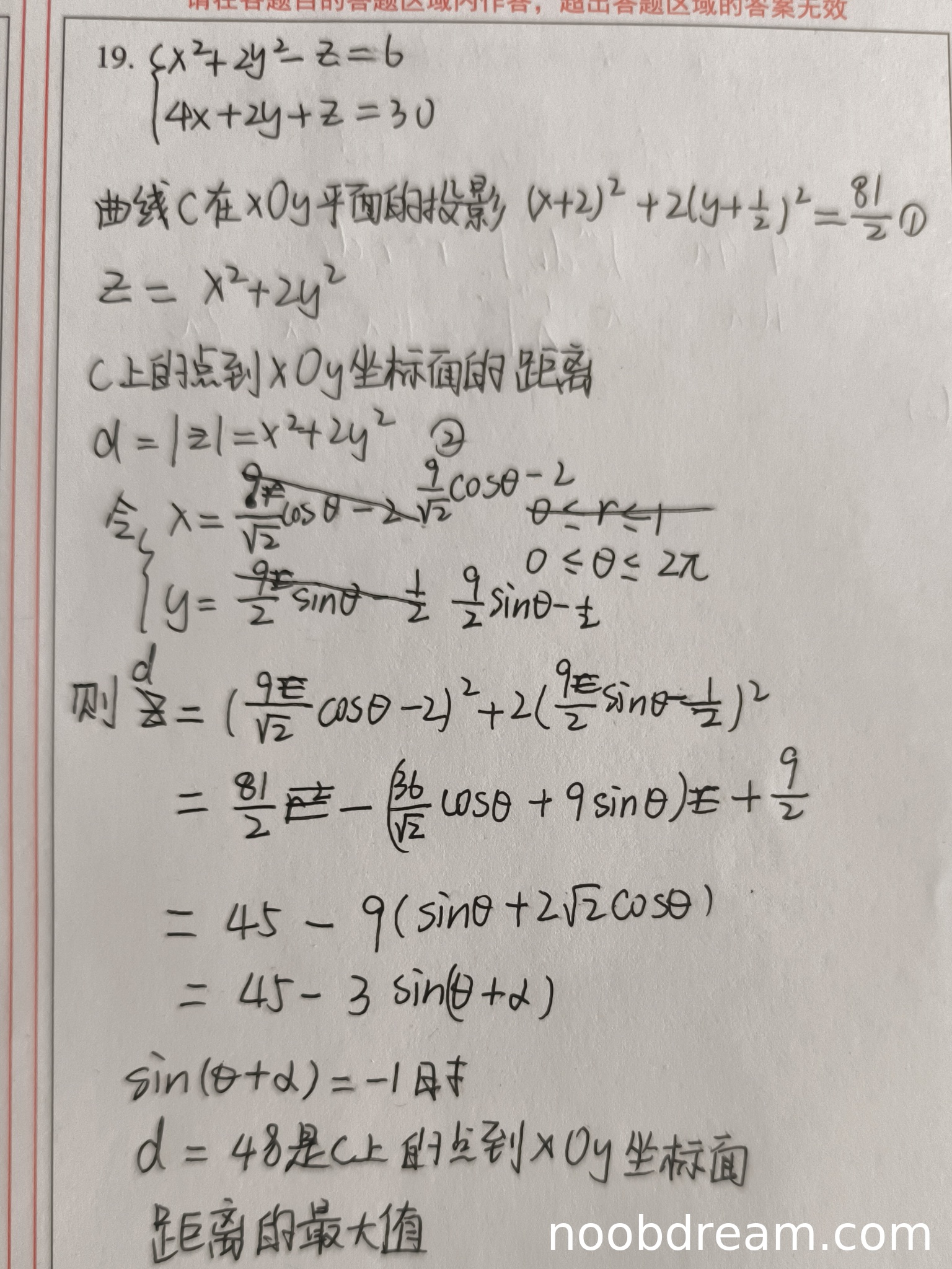 学生正确地将投影曲线参数化,但代入的距离表达式本身是错误的。虽然后续的代数化简过程在形式上正确,但由于基于错误的距离表达式,这一步整体无效。扣3分,得0分。