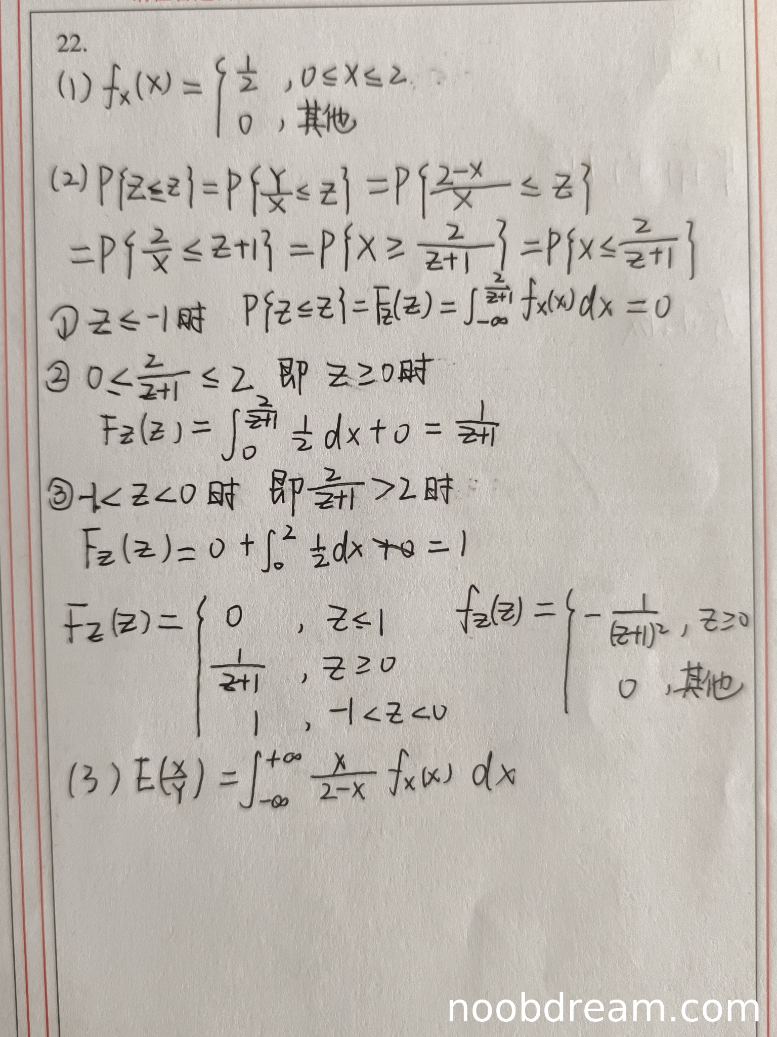 学生在计算Z的分布函数时,错误地使用了X的概率密度函数(误以为X在(0,2)上均匀分布),导致后续分布函数和概率密度函数的计算全部错误。此外,分布函数的分段区间设置不合理(如z≤-1、z≥0等),且概率密度函数出现负值(\(-\frac{1}{(z+1)^2}\)),不符合概率密度的非负性。因此,本小题得0分。