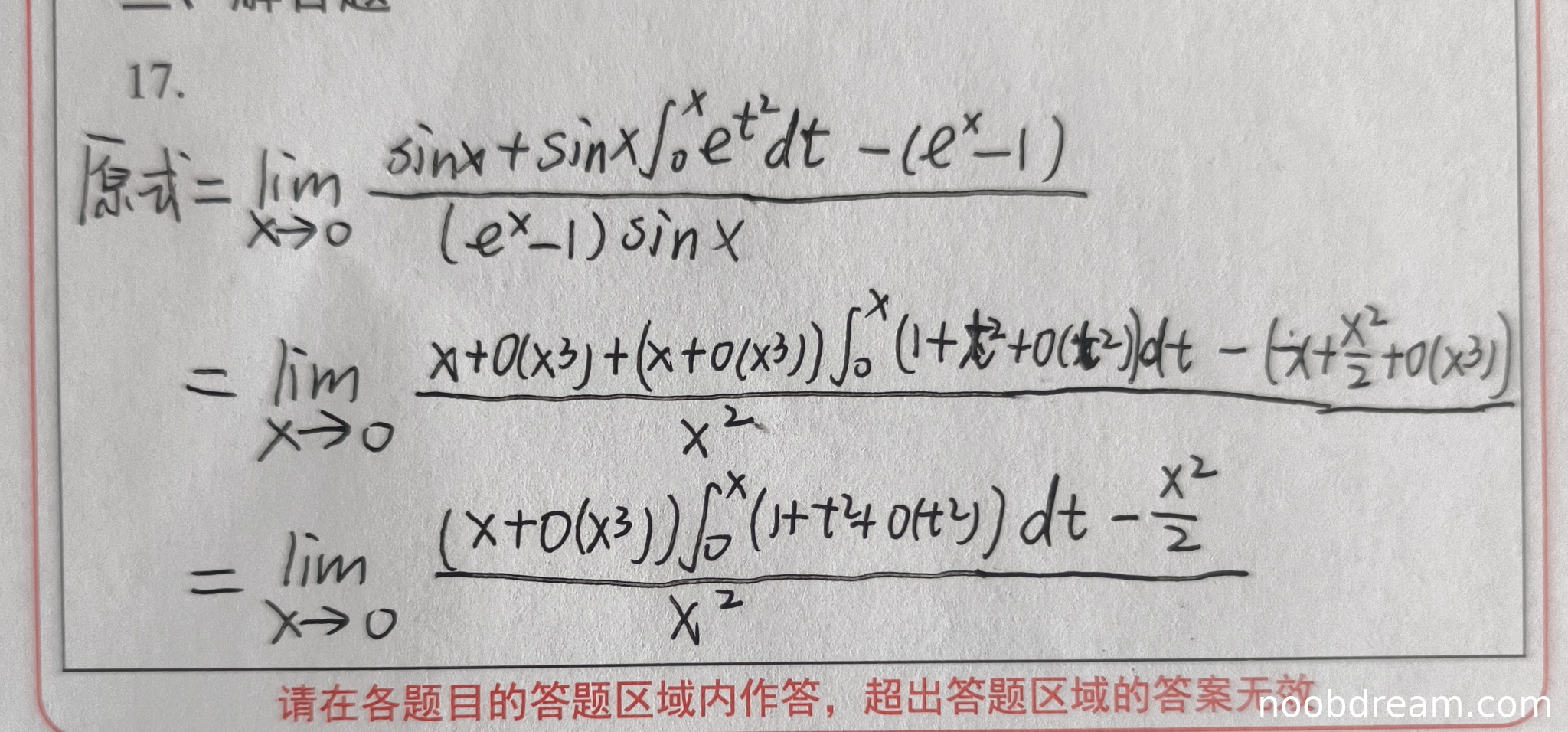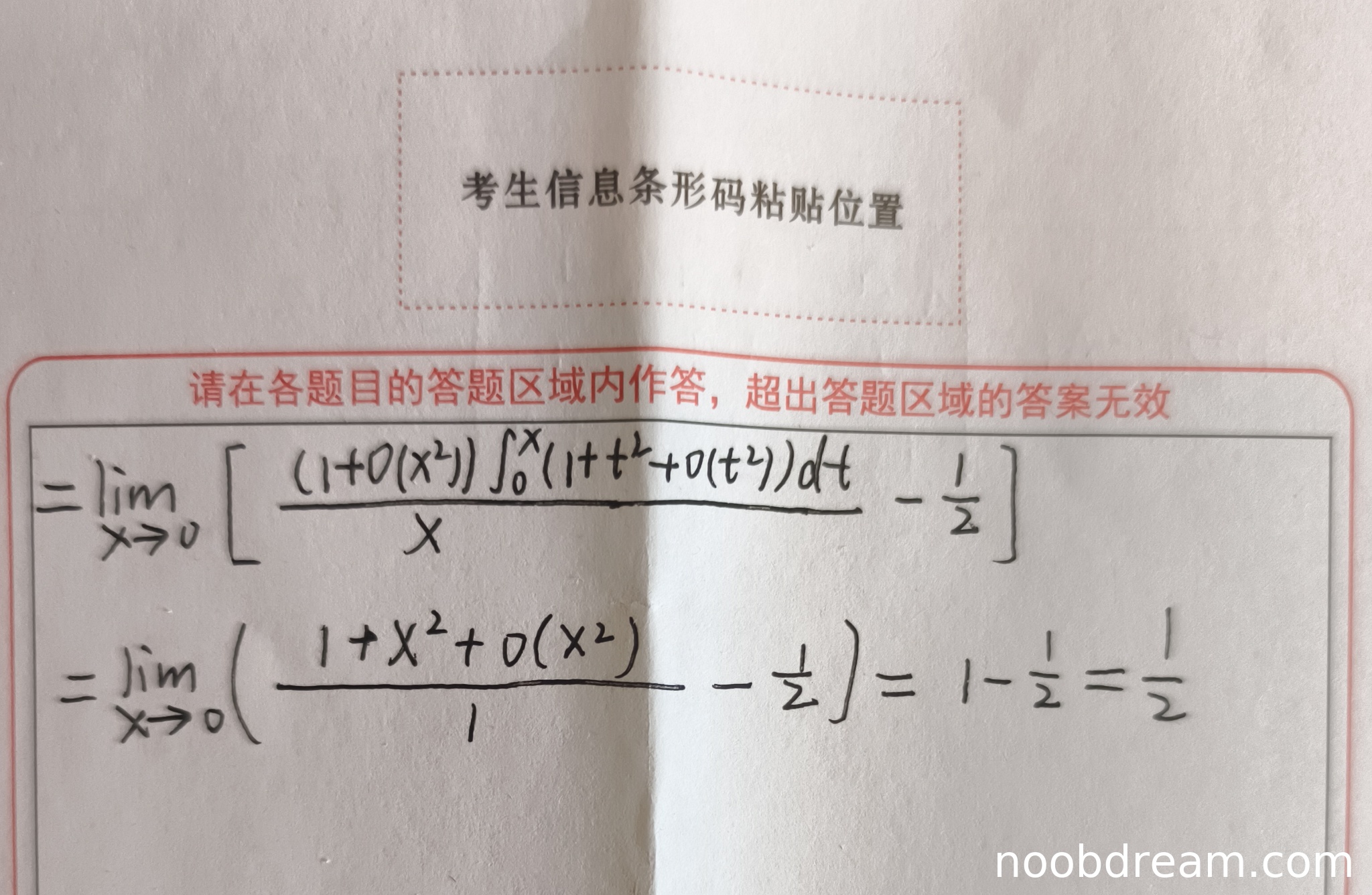 学生作答提供了两次识别结果,其中第二次识别结果给出了完整的解题过程。该过程首先对原式进行变形,然后利用等价无穷小替换和泰勒展开,逐步化简并计算极限。思路与标准答案中的方法三类似,使用了泰勒展开的方法,整体逻辑正确,计算步骤清晰,最终得到正确结果 \(\frac{1}{2}\)。虽然过程中有一些表述不够严谨(例如在等价无穷小替换时未严格保留高阶项,但最终计算未影响结果),但核心思路和计算正确。根据评分要求,思路正确不扣分,且识别错误导致的表述问题不扣分。因此,本题得分为10分。