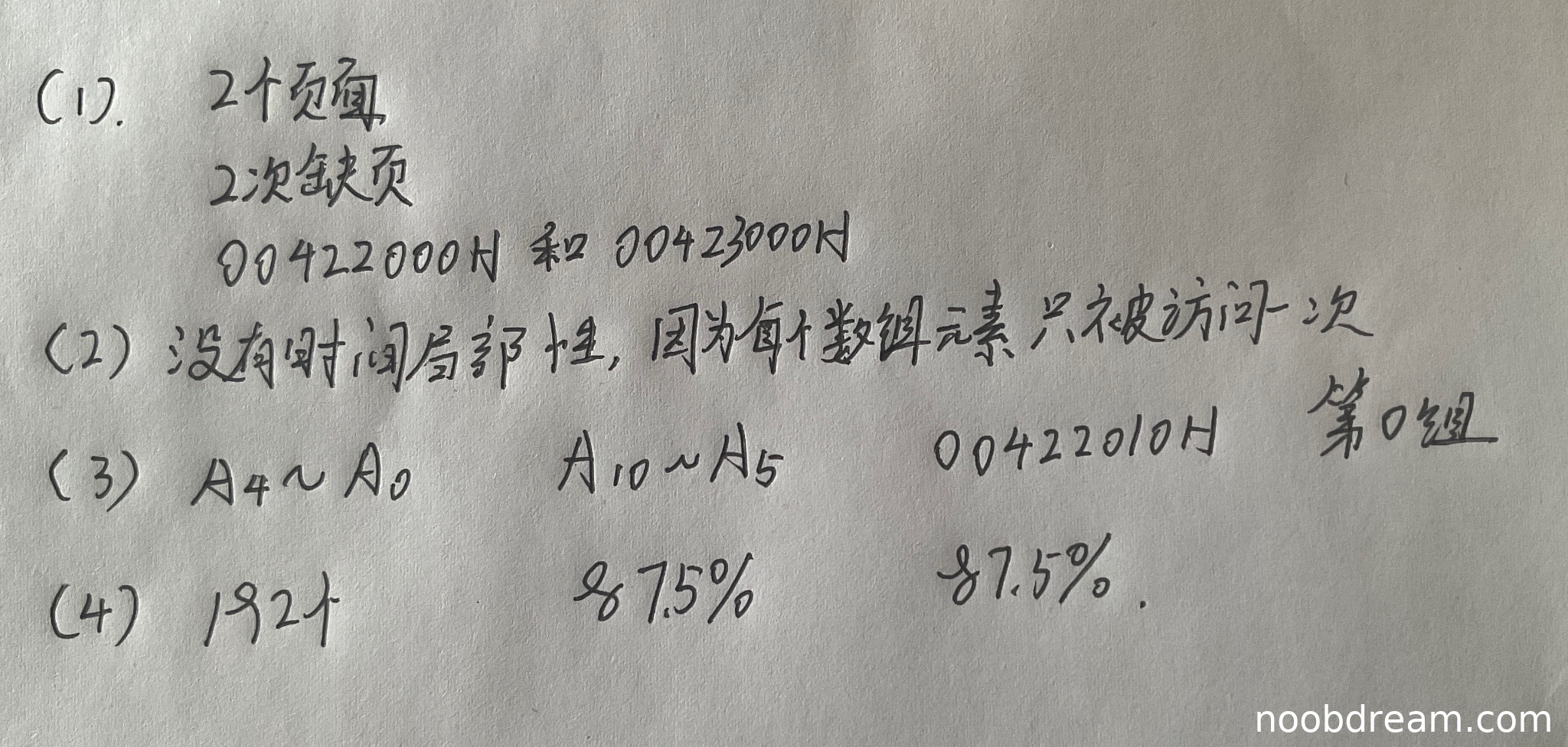 学生回答没有时间局部性正确(1分),理由"每个数组元素只被访问一次"正确(1分)。本小题得2分。