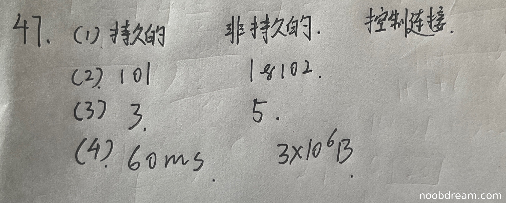 学生答案:"60ms 3×10⁶B" - 时间部分"60ms"与标准答案"60ms"一致,正确得1分。但速率部分"3×10⁶B"与标准答案"2.4Mbps"不一致。标准答案2.4Mbps = 300KB/s,而学生答案3×10⁶B/s = 3MB/s,计算错误。根据评分规则,逻辑错误需要扣分,因此这部分得0分。本小题总得1分。