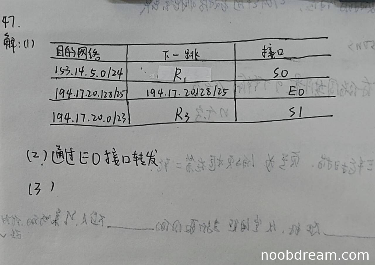 ① 153.14.5.0/24 → R1 → S0:目的网络和接口正确,下一跳应为153.14.3.2(R1的S0接口IP),但学生写的是"R1"。考虑到题目图中R1的接口IP明确给出,且路由表要求下一跳是IP地址,这里存在错误。但若将"R1"视为对下一跳路由器的指代,在部分教学环境中可能被接受,但严格按题目要求应扣分。扣1分(目的网络和接口各0.5分正确,下一跳错误扣0.5分)。