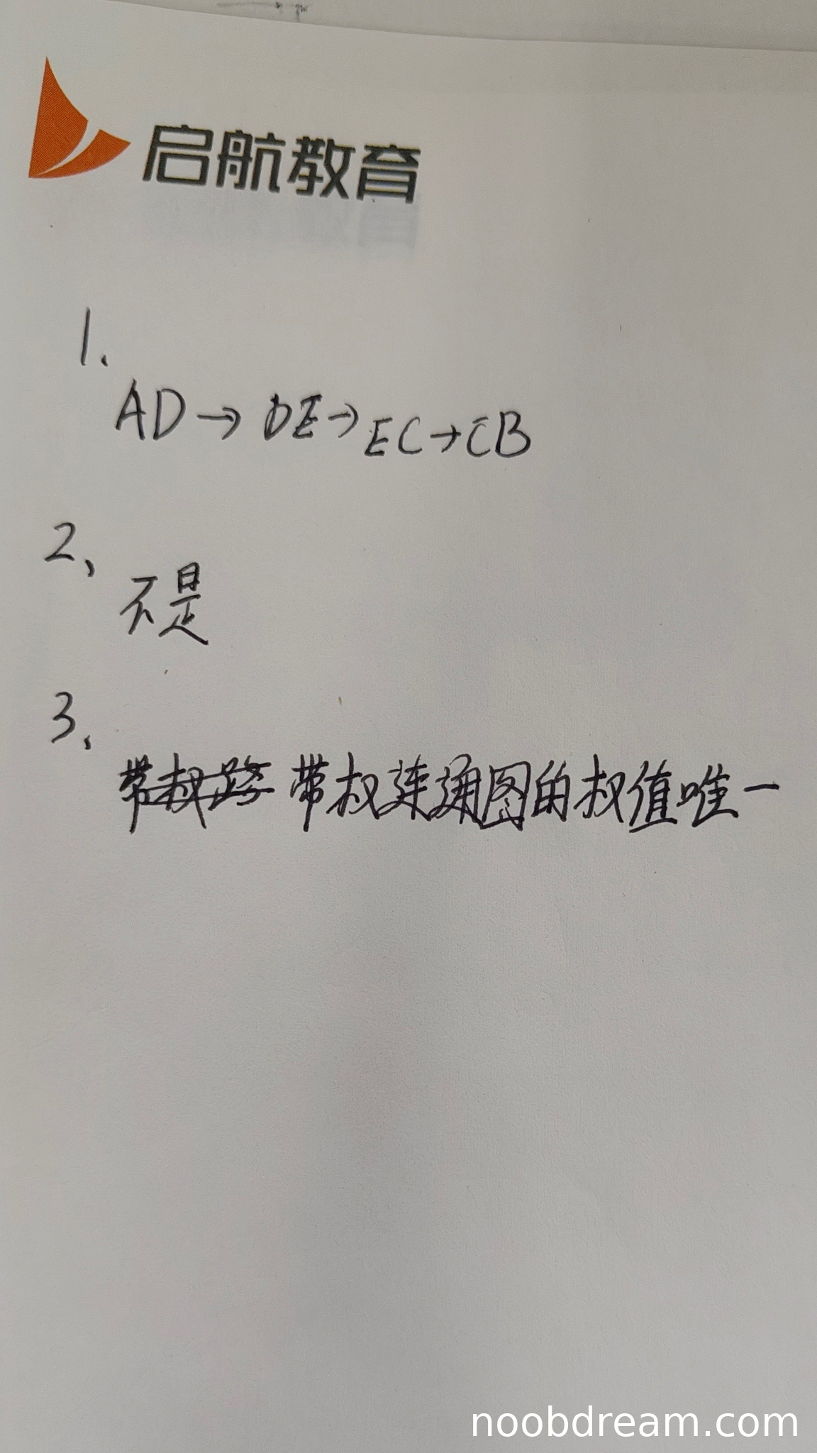 学生回答"带权连通图的权值唯一",这个表述虽然不够精确,但核心意思是正确的 - 当图中所有边的权值都不相同时,MST是唯一的。考虑到可能存在识别误差(如"带权路"可能是误写),且核心思想正确,给2分。