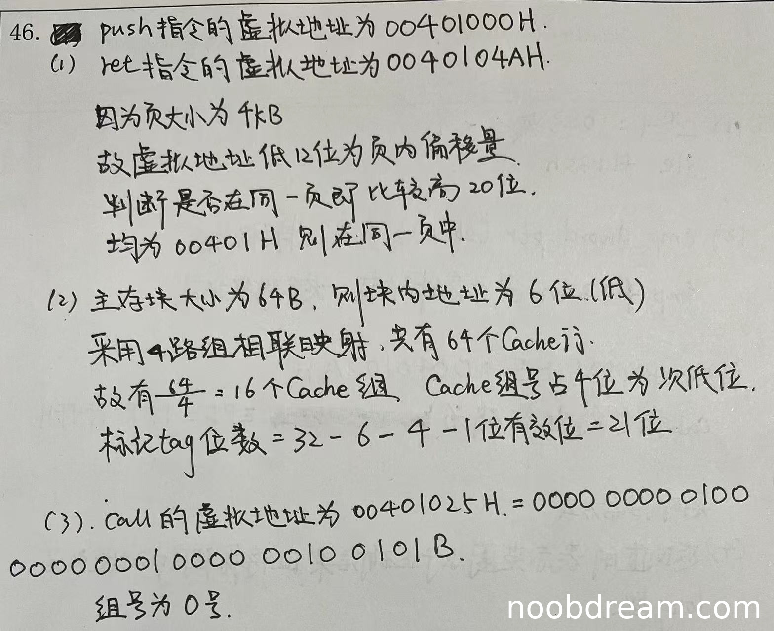 学生正确计算块内地址为6位(低地址位),Cache组数为16,组号占4位。但在计算标记位数时,错误地减去了1位有效位(有效位不属于地址结构),导致标记位数计算为21位(应为22位)。标准答案为:块内地址0~5位,组号6~9位,标记10~31位(22位)。因此,标记位数计算错误,扣1分。得2分。